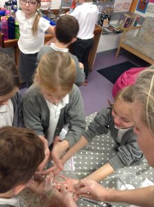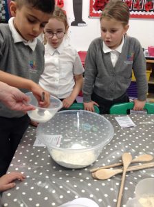 This afternoon we used a kneading and folding technique to prepare our dough for the pizzas. We used maths skills to weigh and measure the ingredients we needed. We then used our scientific knowledge to discuss what happened when we added warm water and sugar to the yeast powder.